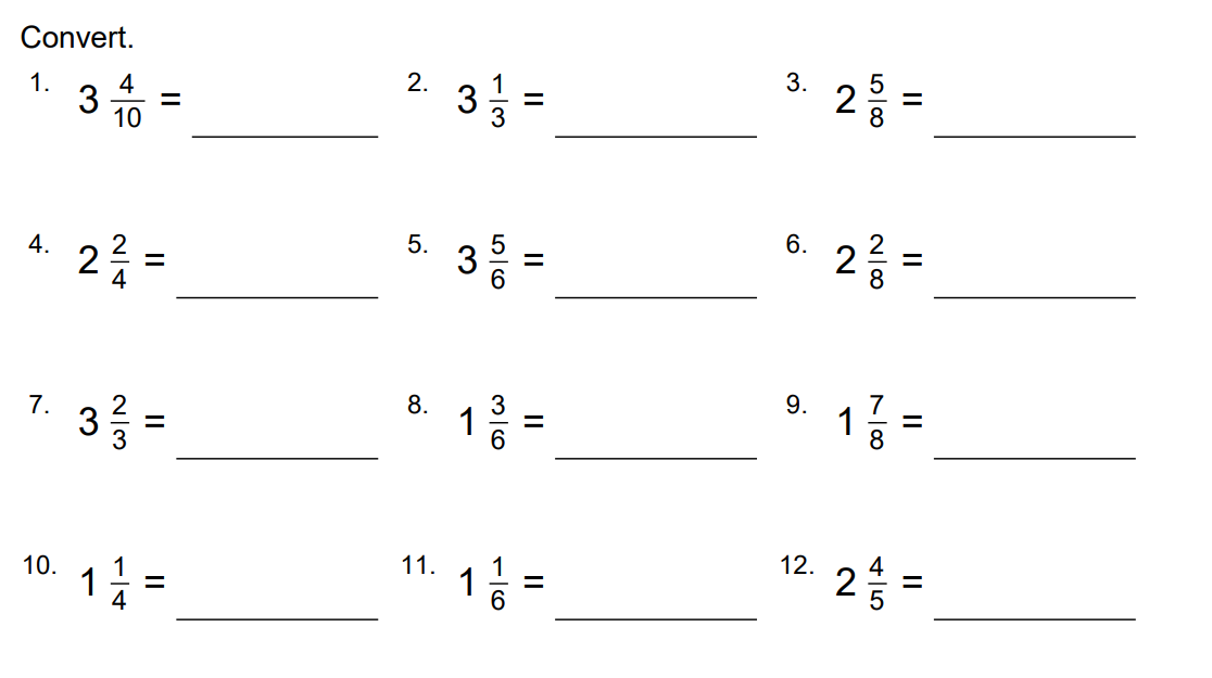 Converting mixed numbers to improper fractions- 2 1/3= 7/3